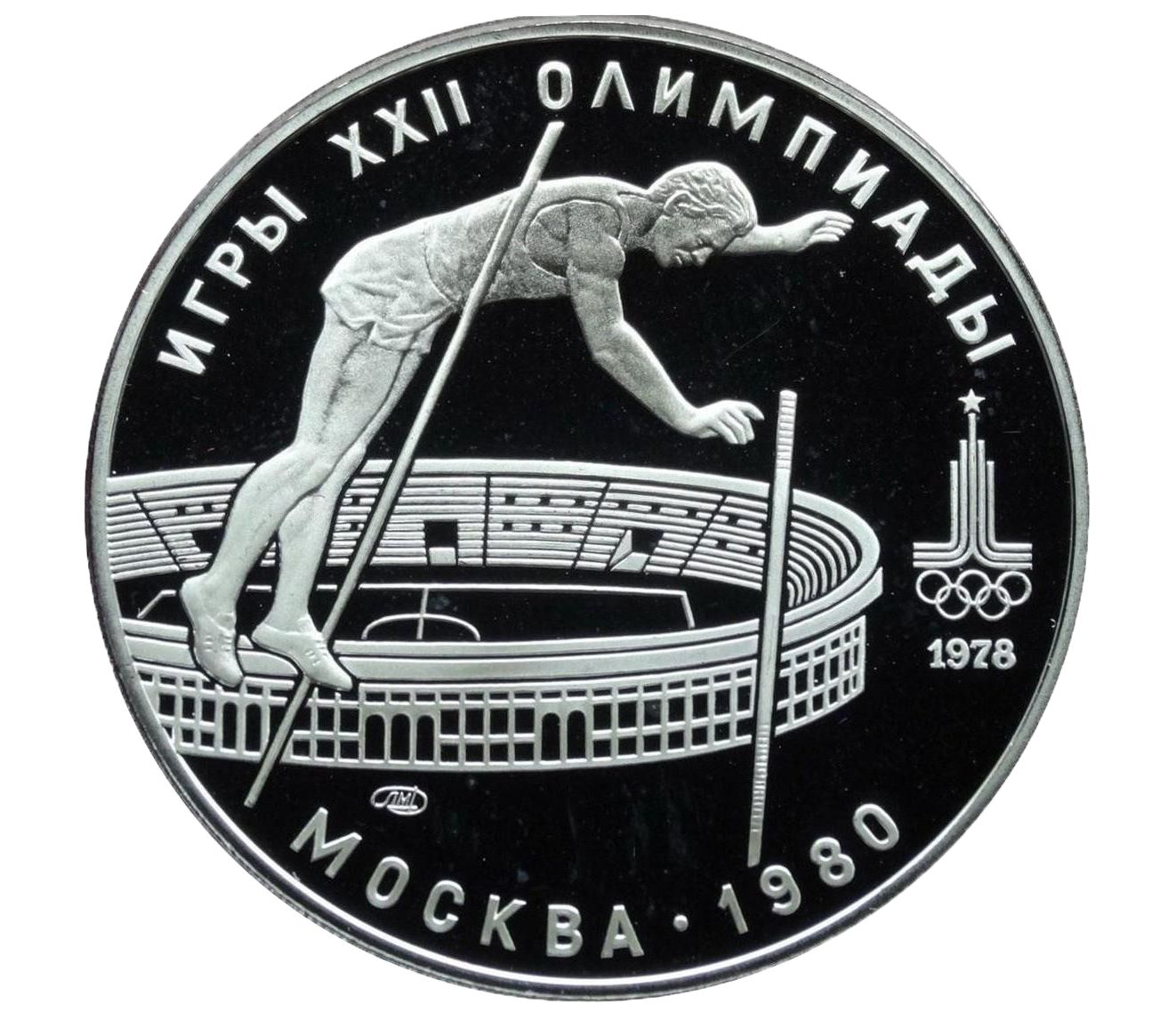 Серебряная монета 10 рублей 1978 «Олимпиада 80 — Прыжки с шестом» ЛМД