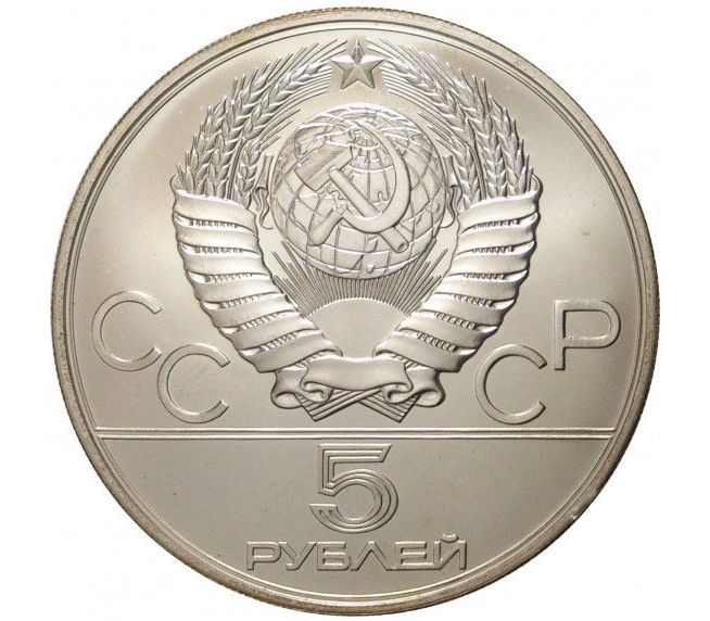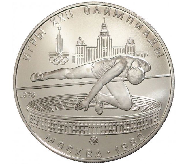 Представляем серебряную монету, выпущенную в СССР в 1978 году к проведению в Москве Олимпиады-80. На реверсе монеты изображен спортсмен, перепрыгивающий через планку. Фоном служит изображение московского олимпийского стадиона и здания МГУ.
