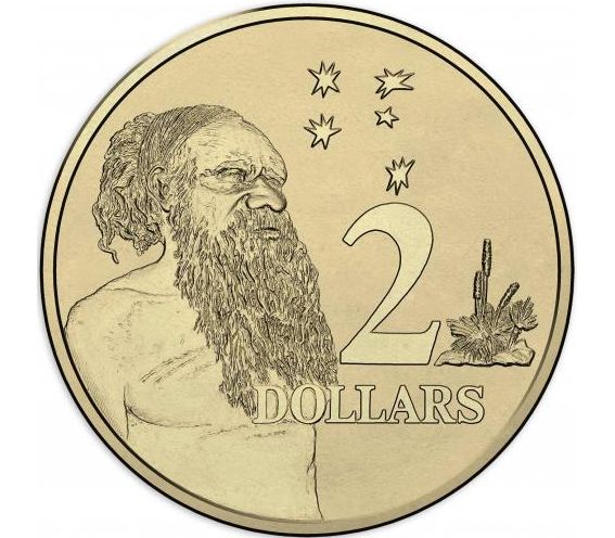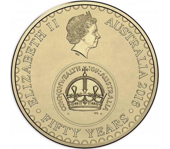 Монета, посвященная 50-летию со дня замены австралийского фунта австралийским долларом. На реверсе монеты изображен представитель коренных народов Австралии — австралийский абориген.