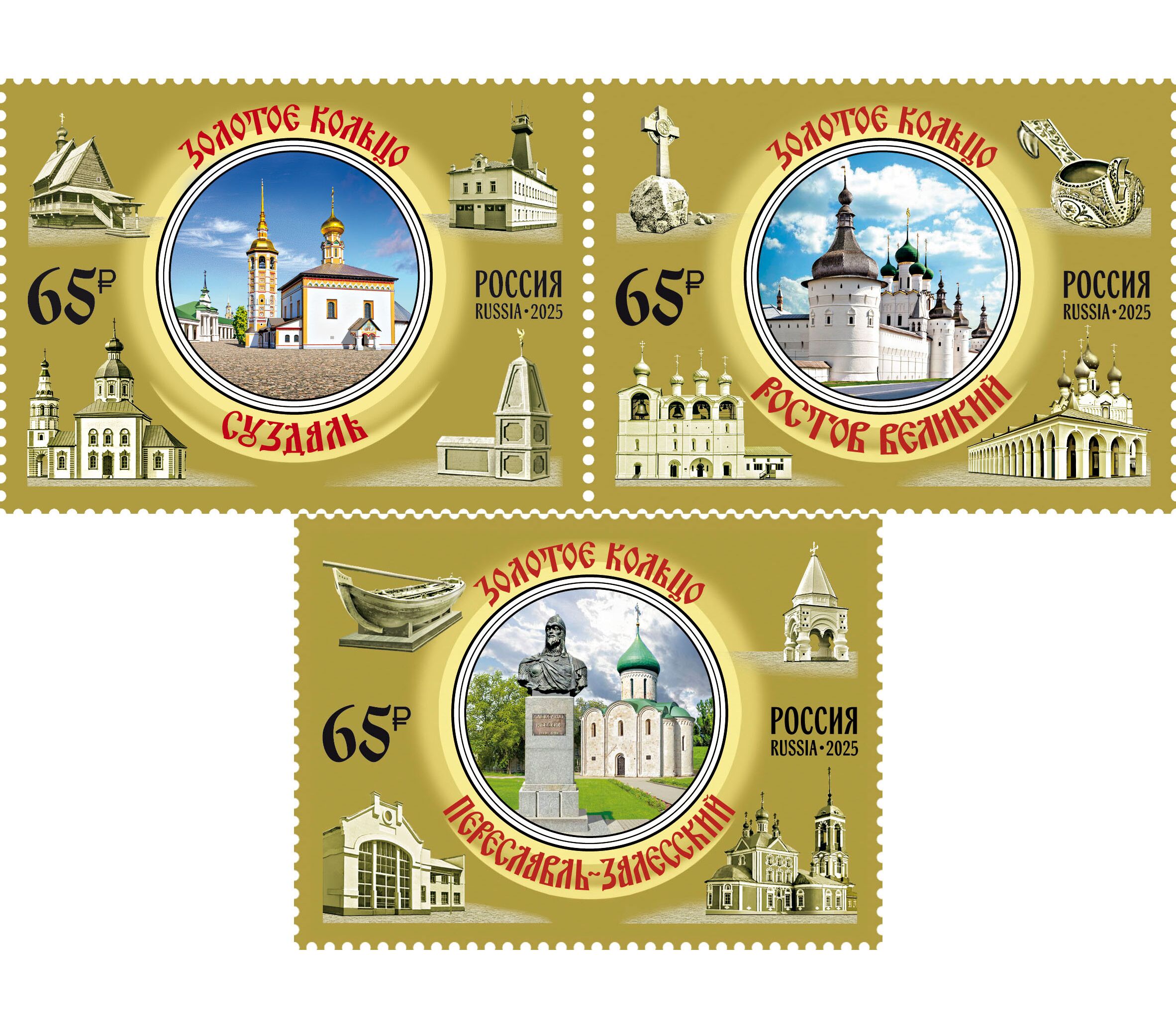 3 марки «Города Золотого кольца России. Переславль-Залесский, Ростов Великий, Суздаль» 2025