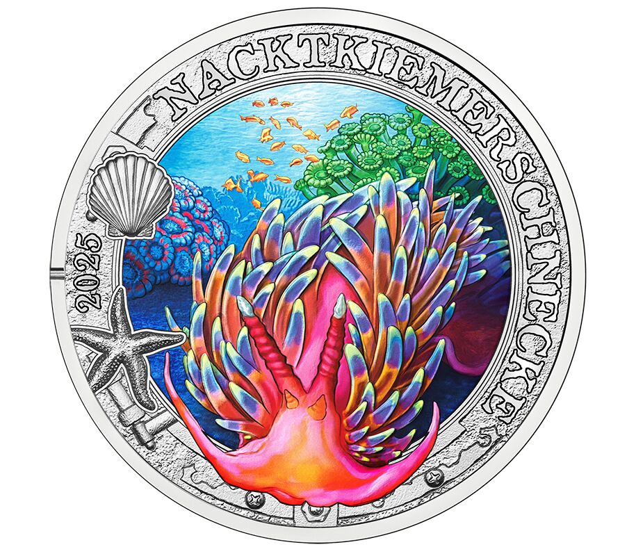 На одиннадцатой монете достоинством 3 евро из серии «Светящиеся морские миры» изображен голожаберный моллюск, чьи цвета меняются под воздействием ультрафиолета.